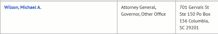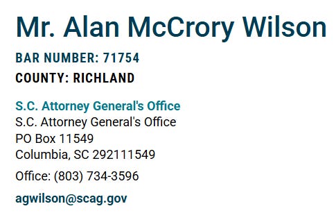 Also curious is that the S.C. Bar lists our AG’s name as “Alan McCrory Wilson,” yet the S.C. Ethics Commission indicates “Michael Alan Wilson.”