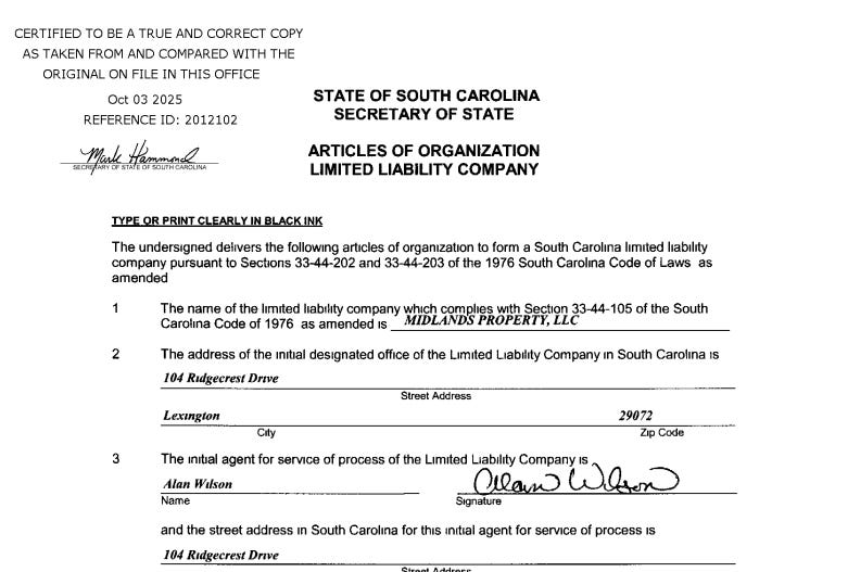 Also noteworthy is that “Alan Wilson” has an LLC that he has failed to disclose on his Statement of Economic Interests in apparent violation of state ethics laws; even more suspect is that the address of record for the LLC is a home he sold over a decade ago.