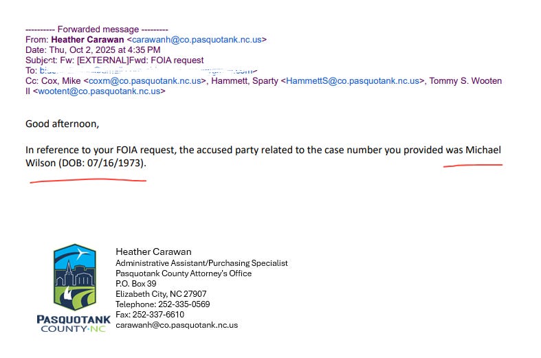 Limited information was available from Pasquotank County Sheriff’s Office and the Albemarle District Jail given the time that has elapsed since the incident. Requests to AG Wilson’s gubernatorial campaign, his FOIA office, and his communications Director were ignored.